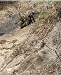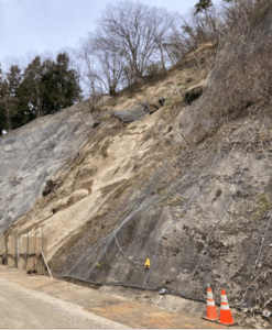 その他の施工事例|住宅解体 災害復旧工事 災害ロックネット復旧前 災害ロックネット復旧中 吹付け法面上部で崩落があり、既存のロックネットごと壊されてしまったのでの それらを撤去して新しいネットを復旧しています。 クレーンでネットを吊り上げて固定しようとしています。